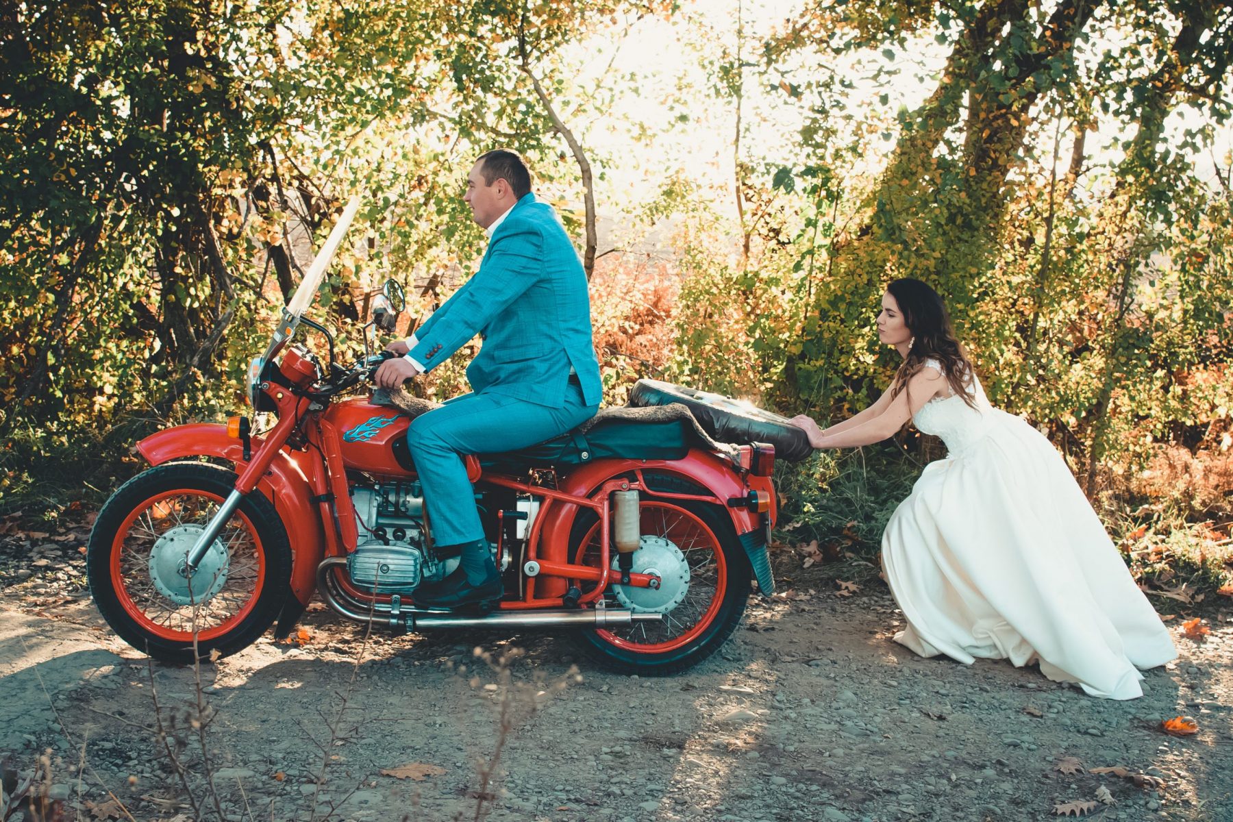 Hop on and hang onto your partner. (This is probably better for brides sporting dresses that aren’t floor length.)